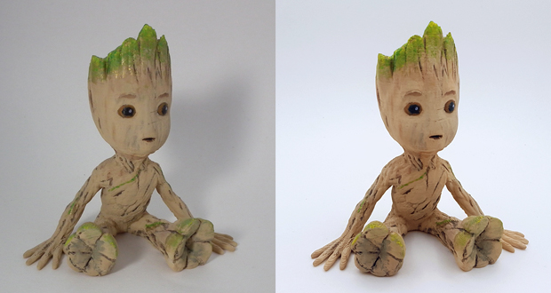 On peut constater qu’à gauche la photo a plusieurs ombres marquées, tant sur le fond que sur le sujet proprement dit. Alors que dans la photo de droite, on peut voir plus de détail sur le sujet et il y a moins d’ombrage. Les couleurs sont différentes aussi parce que le type d’ampoule était différent. Sans entrer dans les détails, disons que le nombre de Kelvin a un impact sur la couleur de la lumière plus il est bas, plus le blanc est chaud (tire sur le jaune-orange), plus il est élevé, plus le blanc est froid (tire sur le bleu).